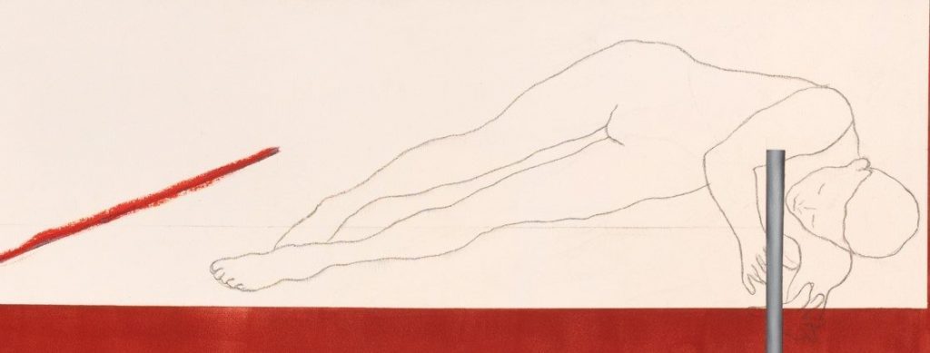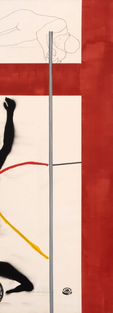 El saltador de pértiga, dibujado con trazo ligero, etéreo, casi un poético boceto, contrasta con la densidad de las siluetas negras y los objetos mecánicos del resto del cuadro. La postura de quien se impulsa con la pértiga –tratando de evitar, superar, o trascender la violencia– da nombre al cuadro y lo convierte en el sujeto del “salto a la violencia”.