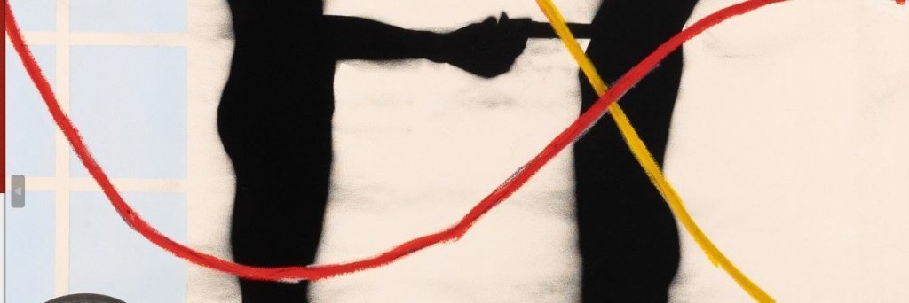 Las líneas roja y amarilla atraviesan el cuadro como ejes de tensión, como marcas gráficas que “tachan” o marcan el conflicto. Así las define el propio Casstillo2 :“trazos de la más pura abstracción informalista”, que conectan con el informalismo a través de técnicas como el automatismo, el collage o la espontaneidad y manifiestan una actitud ligada al existencialismo. Esas líneas para el pintor Emilio Parrilla son, sin embargo, “como relatos paralelos a lo representado”.