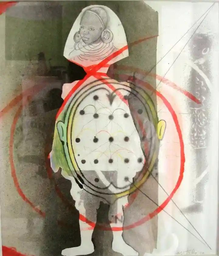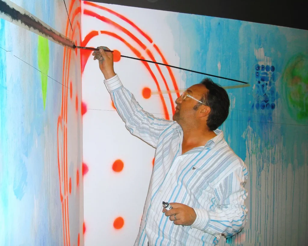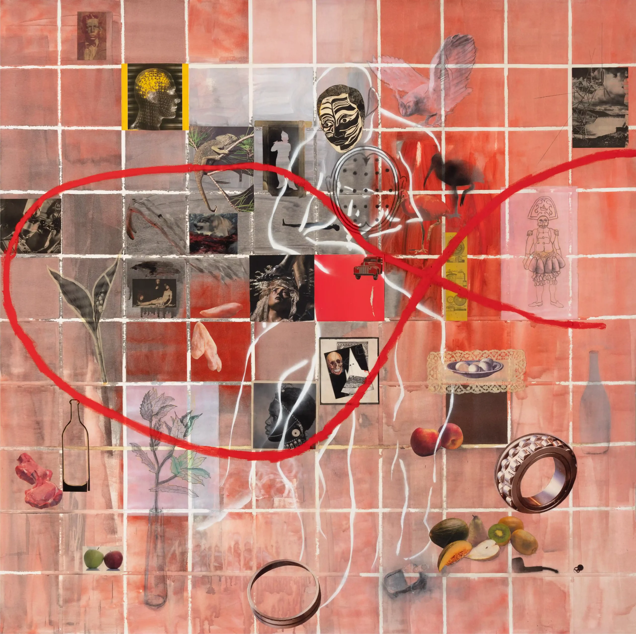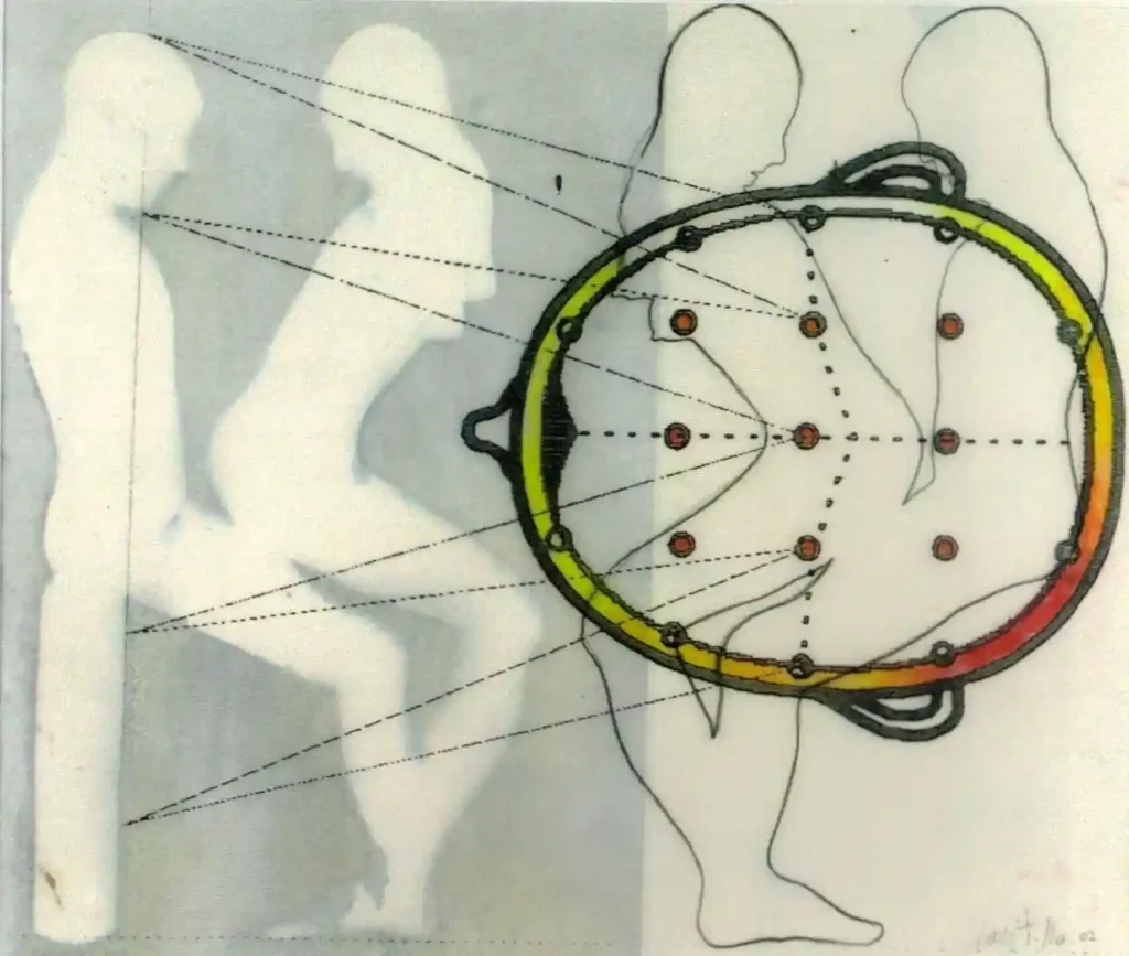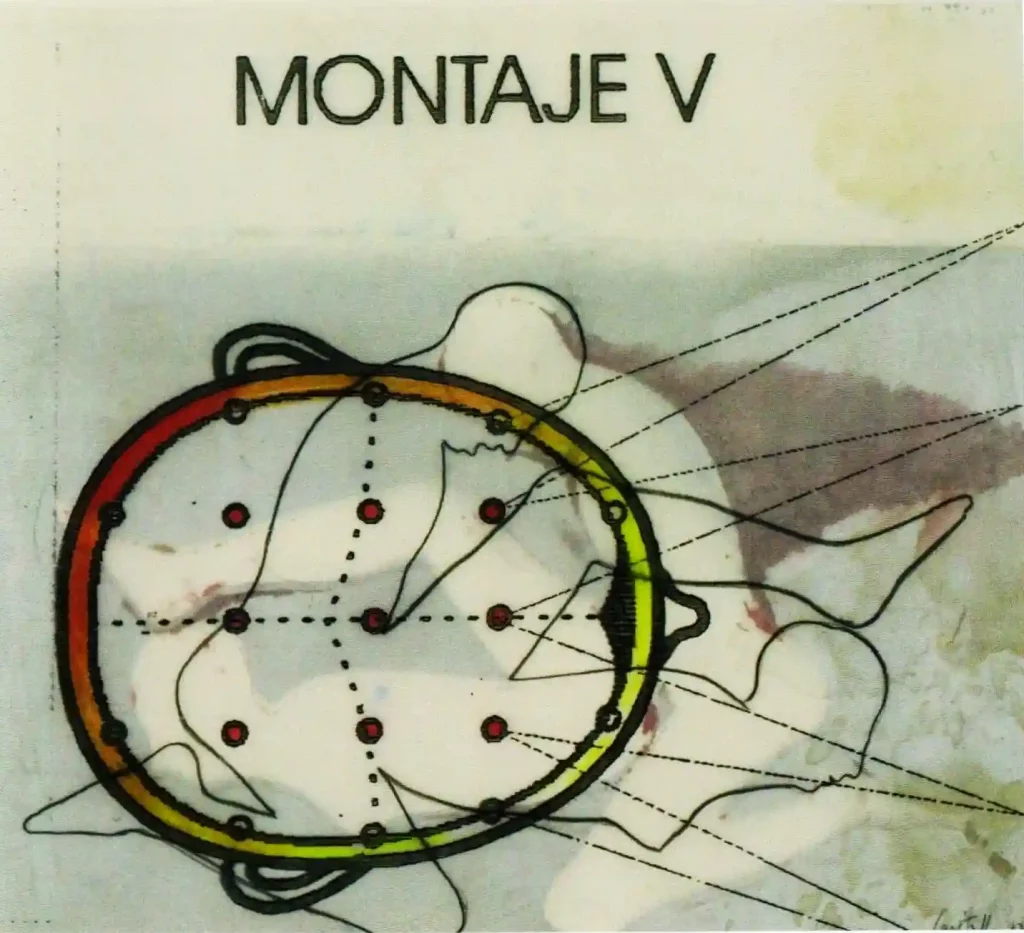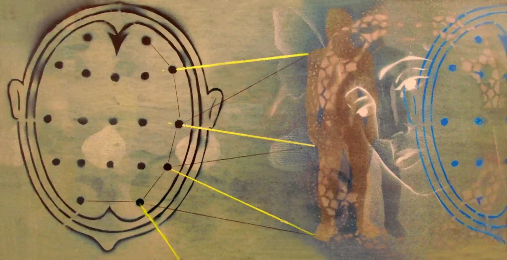 En su obra superpone un cerebro que funciona como un mapa simbólico del inconsciente colectivo, del que surgen canales de memoria que se expanden hacia el exterior y conectan distintos tiempos y culturas.